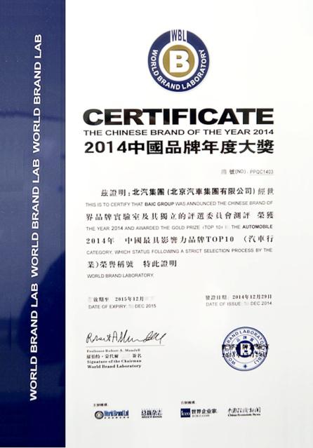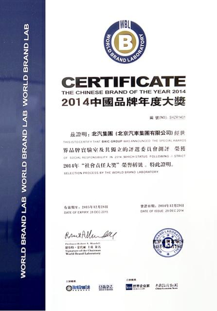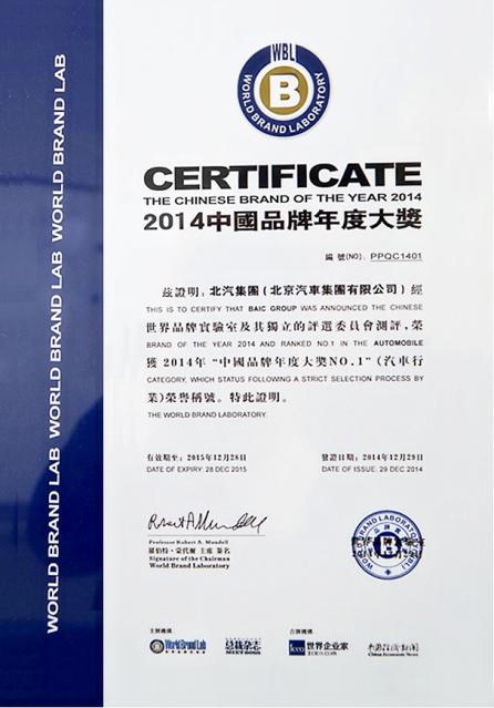 12月29日, 2014“中國品牌年度大獎”頒獎典禮在京舉行,北京汽車集團有限公司(簡稱北汽集團)榮獲中國品牌年度大獎。這也是北汽集團2014年自躋身《中國500最具價值品牌》后再度榮獲品牌大獎。